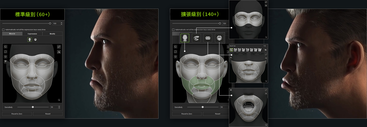 透過「形變滑桿」直接取用「60+ 標準」或「140+ 延伸」混合形狀。其中數個使用形變滑桿的特殊值給予表情細節完整控制;允許輸入外推強度值(+/-200);觀察「肌肉面板」及「表情範本」驅動哪些混合形狀。此外,關鍵字搜尋自訂目標形變及輸出至外部 3D 工具可實際看見混合形狀名稱與其數值。