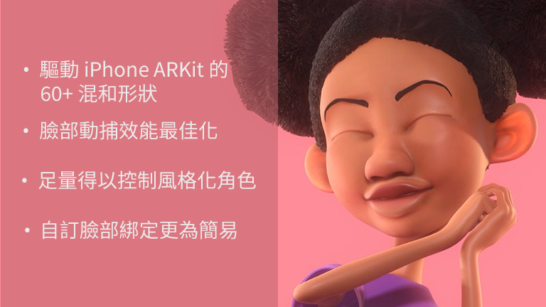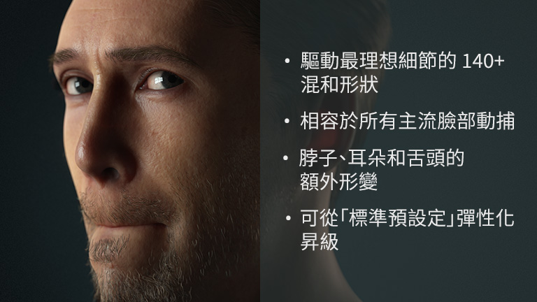根據使用者選的專案類型提供兩等級的「表情預設定」。用於「標準級」的 60+ 形變相容所有比如 ARKit 的臉部動捕,且對互動 XR 或遊戲而言皆效能友善。用於「延伸級」的 140+ 形變則精準控制角色表情的細微差異,最適用於擬真製作或 AI 驅動的數位人物。 參考線上指南 >