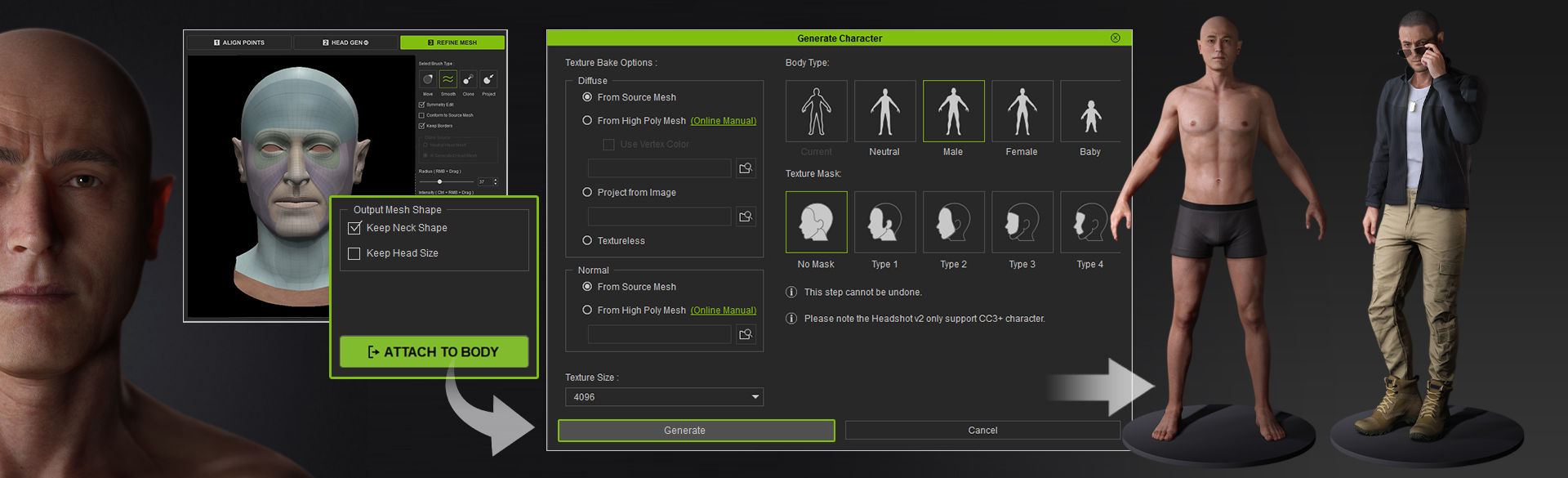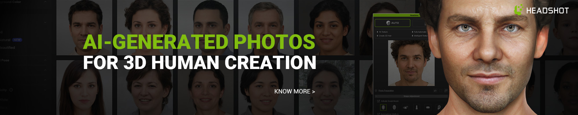 Headshot 2 是 Character Creator 的 AI 升級外掛程式,可從照片和 3D 模型產生進階 3D 即時數位人類。提供精確的模型擬合、貼圖燒製和全身動態功能,超越前代以及競爭產品。利用「自動」和「專業」模式,提供一鍵生成低解析虛擬頭部與 3D 頭髮的功能、同時提供大量的雕模選項及精修之進階工具處理高解析貼圖。它的多功能性和全面功能集使其成為業界中靜態模型轉換為全綁定 3D 頭部的首選解決方案。