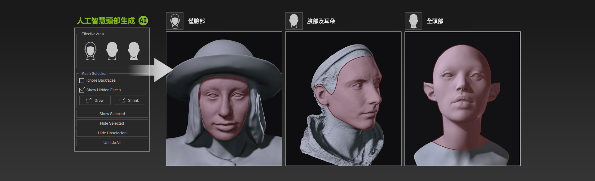從頭部大範圍與臉部塑形到獨立特徵 - 頭部輪廓、臉部、眼睛、鼻子、嘴巴與耳朵。利用快速鍵在區塊間輕鬆切換,對特定部位造型迅速精修。
