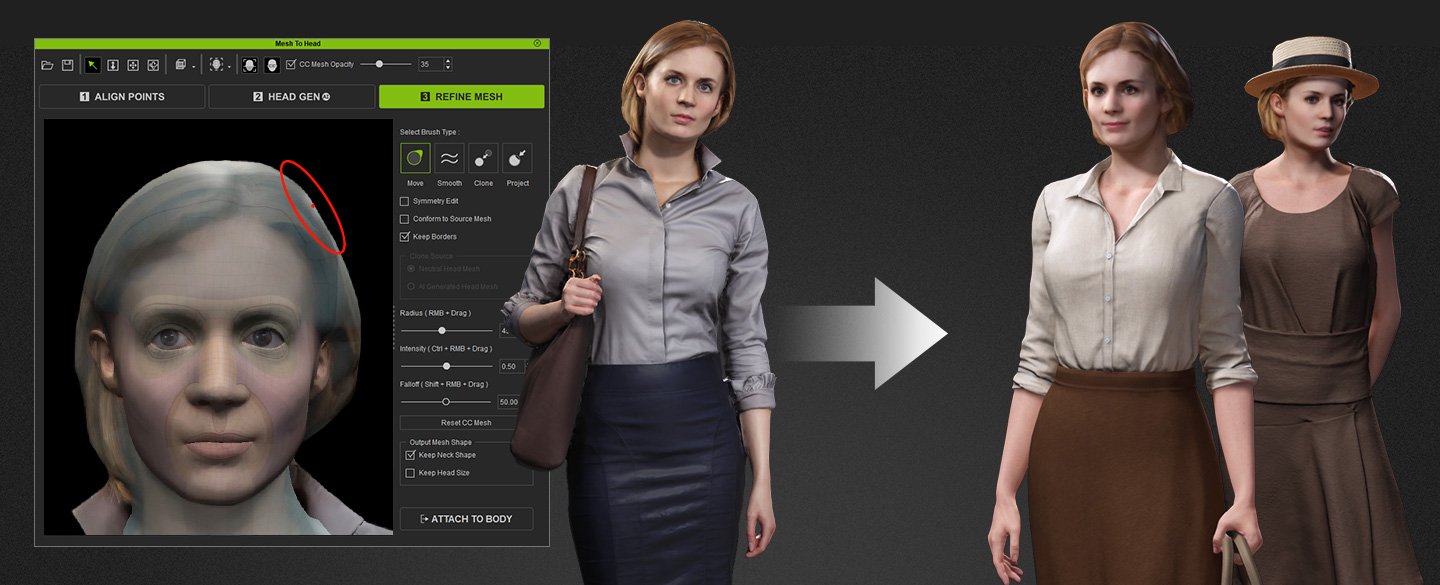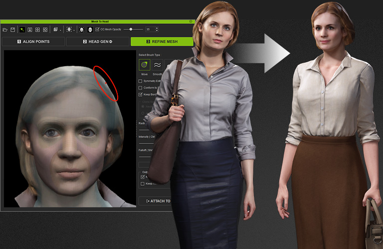 Headshot 第一次計算的初始成果就能達到很高的相似度。再使用塑形變形工具來塑造與細修。Headshot 創建的頭部皆已完全綁定能馬上使用 iClone 製作動畫或輸出至如同 Unreal 這樣的遊戲引擎。
