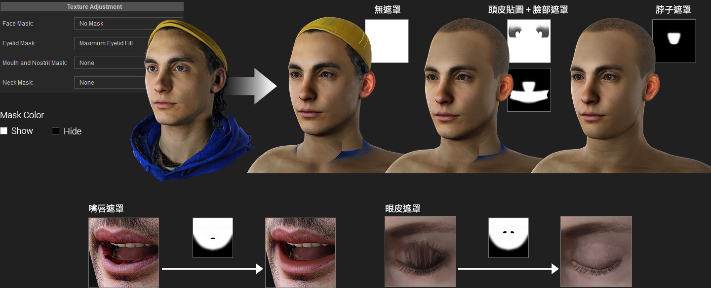 對於 Headshot 引擎處理側面貼圖的方式感到好奇嗎?為了創建不同年齡、性別、髮型與鬍子風格的數位人,Headshot 為最佳化的虛擬人外觀提供許多皮膚預設集與遮罩選項。