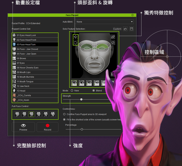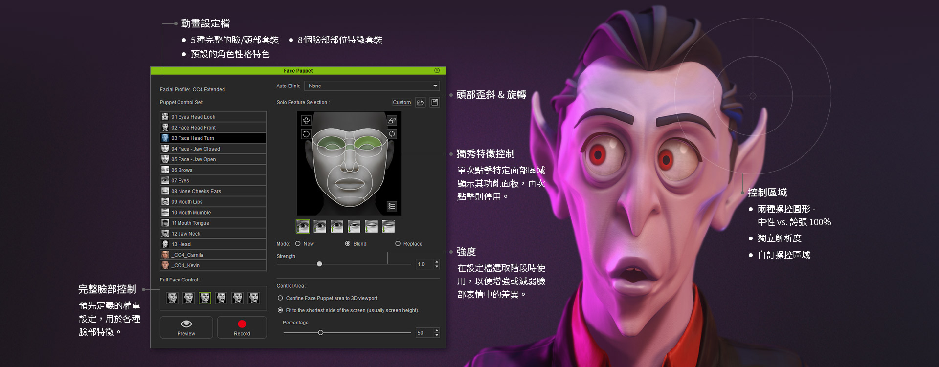 一旦透過唇形同步,臉部動捕或操控產生臉部表情之後,便可用「臉部關鍵格編輯器」微調五官細節。關鍵格會覆蓋及混和至現存表情並存於時間軸軌道中以利後續編輯。