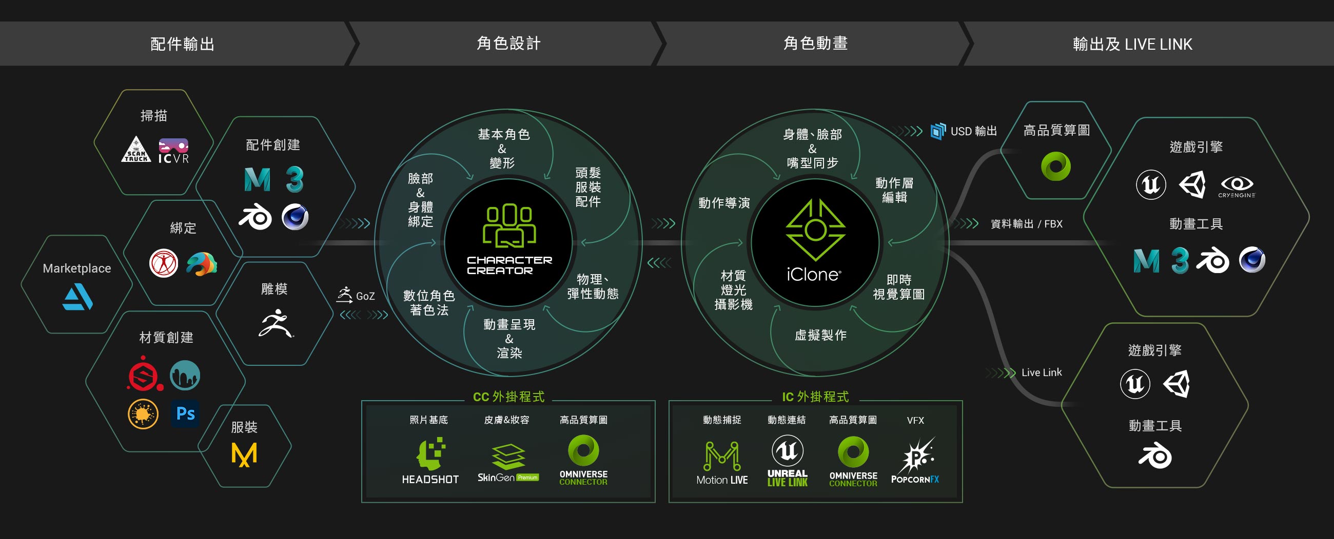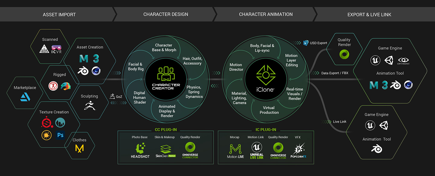 iClone 及 CC 無縫串接成一個大型「角色設計至動畫」平台,大大簡化許多 3D 應用程式之間往返的產出方式。