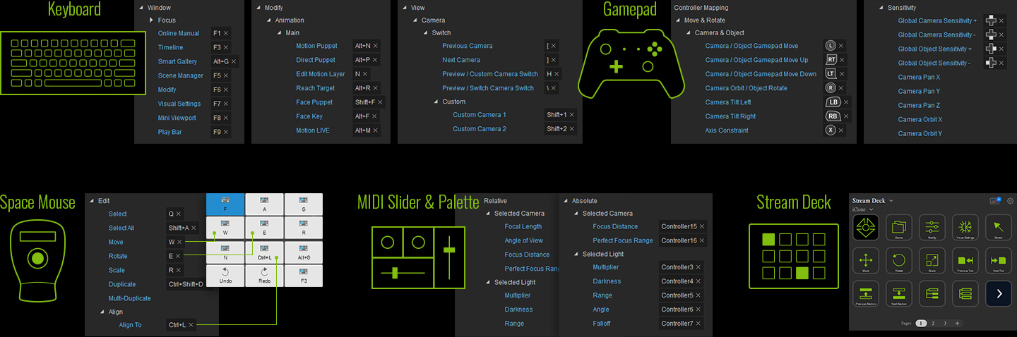 若要 iClone 更能使用者導向,幾乎所有 iClone 功能都能對應至使用者定義的快速鍵,尤其是 Windows 相容設備。此開放架構設計可徹底改變使用 iClone,或 Live Link 動態至其它 3D 工具的方式。
