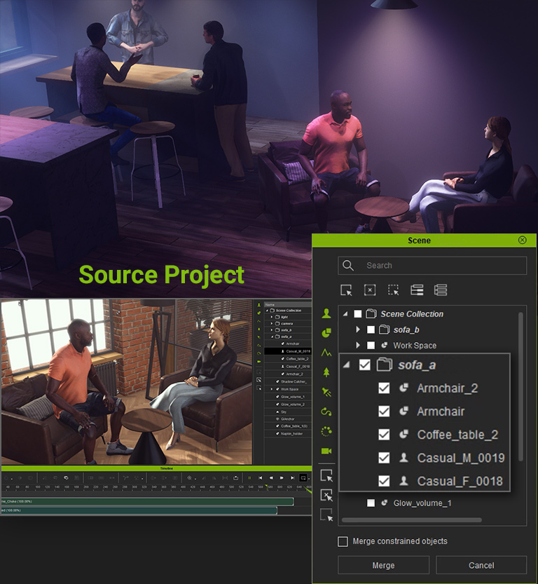 用「集合」合併專案及場景;輕鬆從各專案協作及結合內容物。